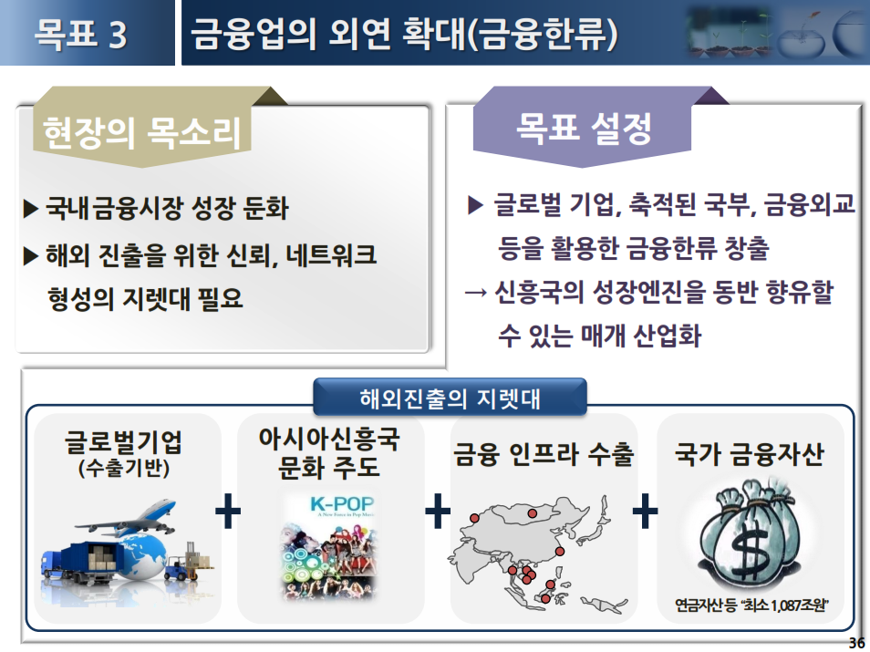 금융위원회가 내놓은 ‘금융업 경쟁력 강화 방안’중 금융 한류와 관련한 부분이 있었습니다.