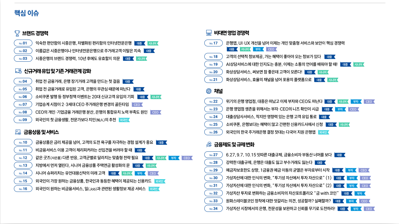보고서가 담고 있는 핵심이슈입니다. 총 40개 주제입니다. 은행과 유사한 업종에서 일하는 분들이면 한번쯤 고민했을 사안임니다.