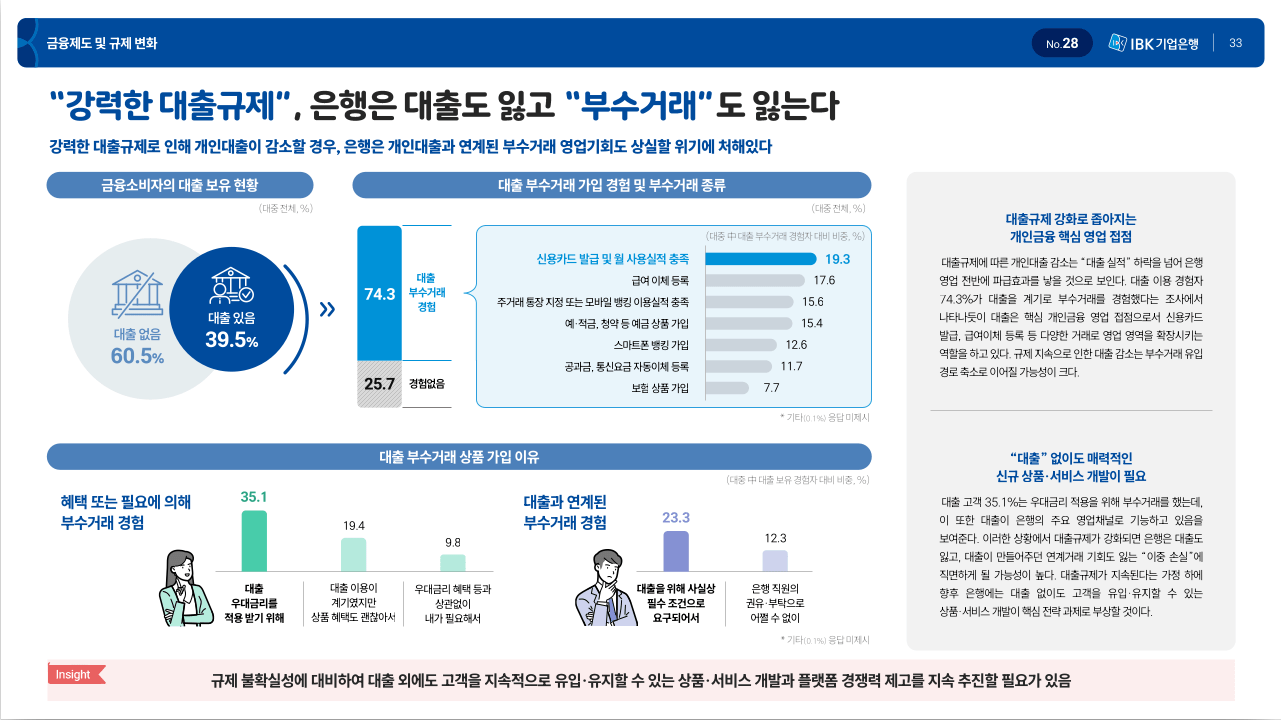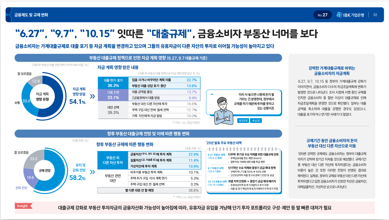 보고서중 개인적 관심이 있던 주제입니다. 첫째는 부동산대출규제입니다. 생산적 금융과 자본시사장이 현재 금융의 화두이고 이의 출발점이 부동산대출 규제이기 때문에 은행 고객들의 생각이 궁금했습니다.