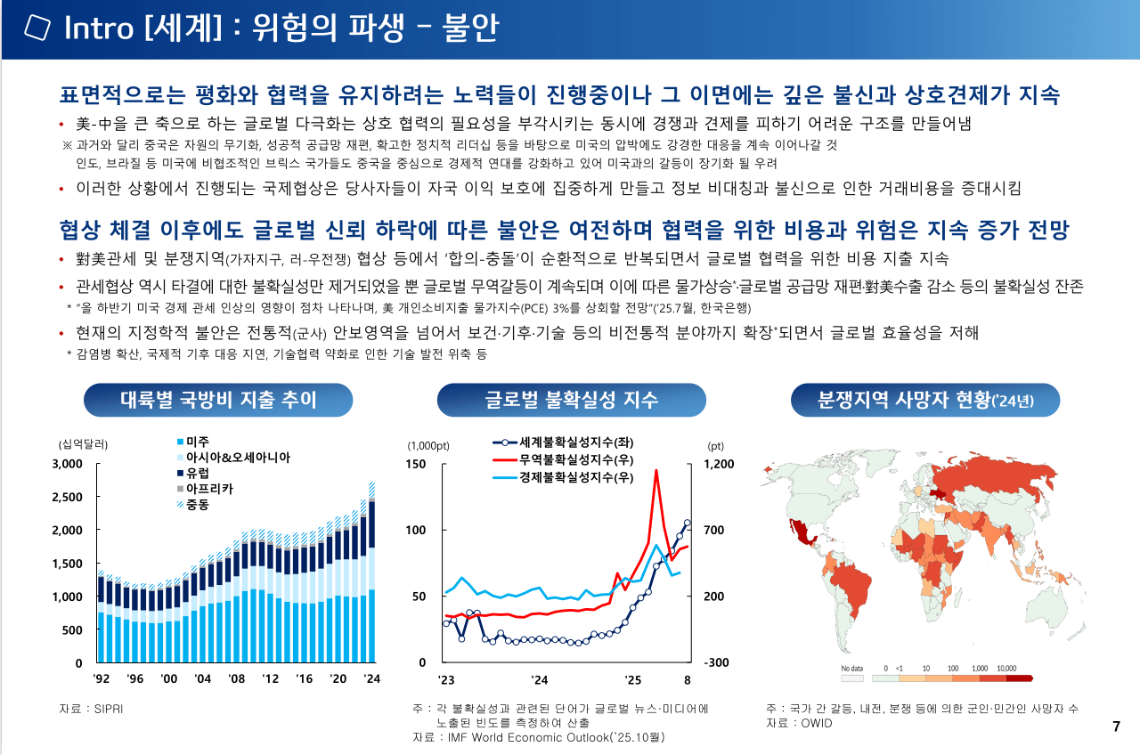 참고로 경제연구소가 작년말에 발표한 2026년 전망입니다. 보고서중 나라별 전망이 있습니다. 미국-이란전쟁이 있는 현재를 기준으로 보면 재미있습니다. 세계경제를 3가지 주제로 분석하였습니다.